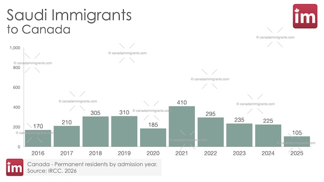 In 2025, 105 Saudis were admitted to Canada as permanent residents.